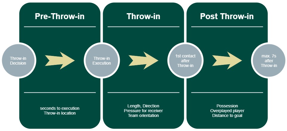 To provide at first some context, I want to share some information about the DFB Hackathon. The 1st one was a really small one, which just happend over the period of 2 days. The 2nd was now based on the key facts: more time, more data, more re-usable results. We were provided 2 seasons of Bundesliga position data and different challenges, which should be solved over a period of 6 months. A extension was cause by all the COVID problems. My team had the task to create a throw-in model, to measure the risk and reward of throw-ins in football. For everybody already aware of, how such models are created: we used a similar approach like for expected goal models. Based on huge amount features for the specific match situation, a machine learning algorithm determines the expected risk or reward for specific throw-in execution.