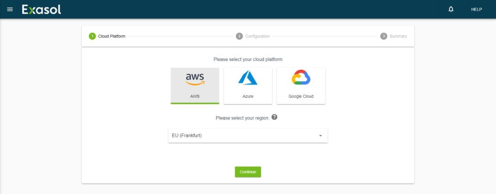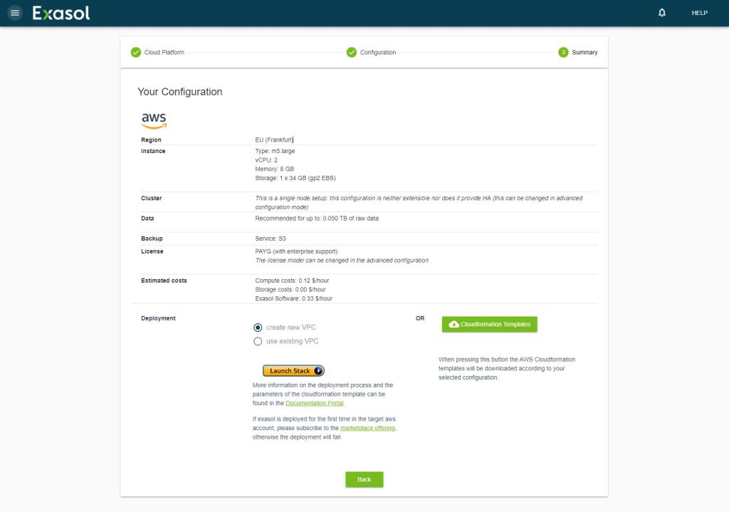 As already mentioned, Exasol uses configurable Cloudformation templates to make the installation process a bit easier. To make it even more easier, they offer a web frontend, which leads through the configuration process. In my case, I want to create an Exasol instance in my AWS account.