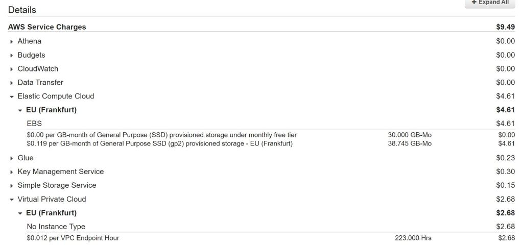 As I already did it in the last post, I again also want to take a look at the cost side. Running a EC2 instance produces definitely more costs than executing some single Glue Jobs. The pictures show the pure standby costs for March, without starting the instance at all. Looking the costs per service reveals that the VPC endpoints and the EBS storage produce about 75% of all costs for such a small configuration. The cost of a larger system is mainly determined by the size of the expensive EBS storage.