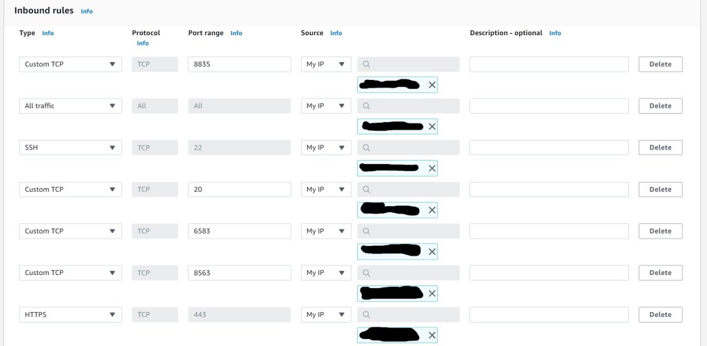 To ensure nobody else it able to connect to the public IP, it’s possible to whitelist a list of source IPs. Therefor you have to go to the security group of the instance and adapt the input rules. All imporant ports should already be listed. You just have to change the source to “My IP”, what automatically inserts your current public IP address.