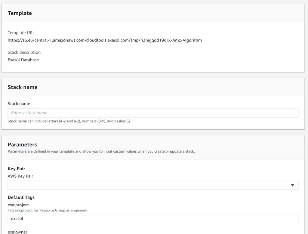 After launching the stack, you have to provide some additional information: a stack name, the created AWS key and passwords for the sys user as well as for the Exaoperations administrator. If you already used an Exasol DB before, this should not be to new.