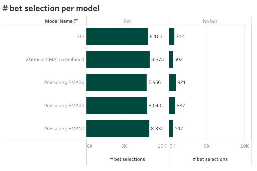 At first, we take a look at the betting profit rank. This is the most important rank, when it’s about the performance of a predictive model. To calculate the betting profit, I simulated an automated betting. Based on Bet365 market odds and the predicted probability for each match I determined, whether there is value for a single bet on the 1×2 market. For each match only one bet is selected, even if e.g. the Draw and Away win odds seem to offer value. This results in a different bet selection for the different models. The ZIP model determined value in 8.165 different matches. 712 matches did not show any value in any market.