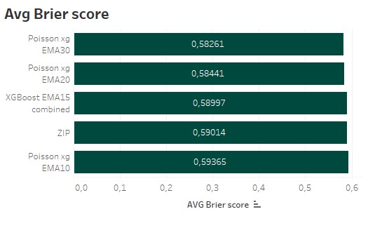 The shortterm Vanilla poisson model as the most profitable model has got the worst Brier score. The 2nd best and 3rd placed model, regarding the profit, are the best models based on the Brier score.