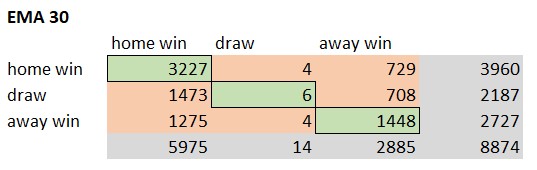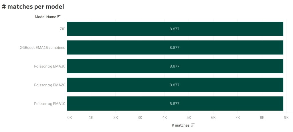 The green elements of the confusion matrix represent the True Positive cases. The model predicted the result correct. The Vanilla Poisson xG EMA 30 model predicted 4681 matches correct. That’s an accuracy of 52,7%. The XGBoost model only predicted 4587 matches. Following picture shows the ranking based on the model accuracy.