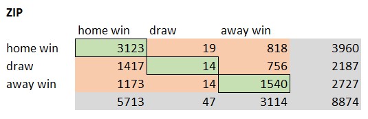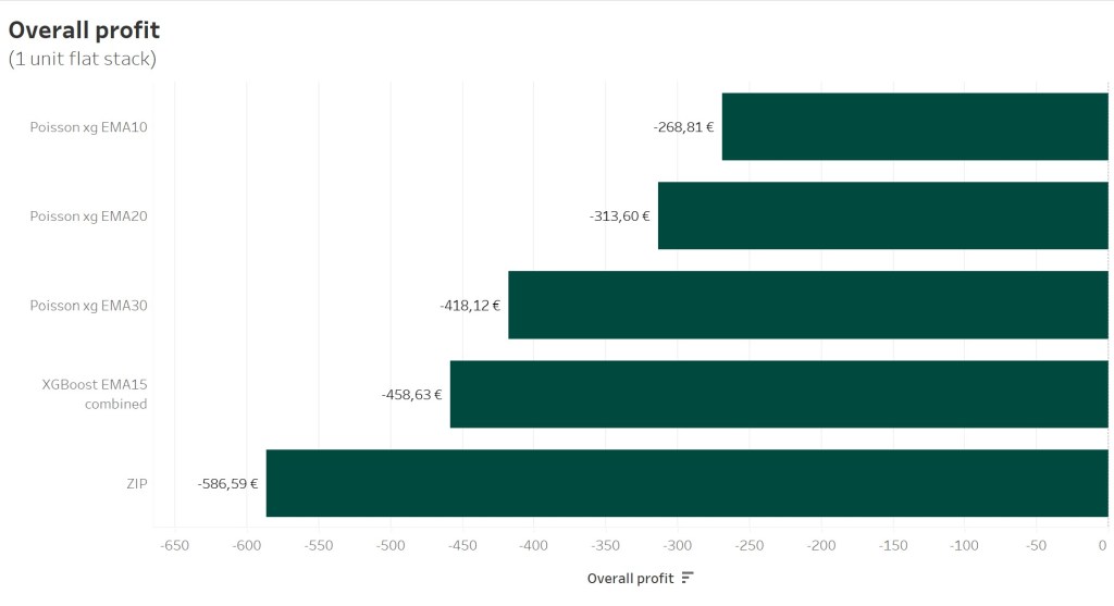 The best model, when it’s about the profit, has got the lowest accuracy. The ZIP model, providing the 2nd best overall profit, has got the 2nd best accuracy. That should be enough to understand, that a predictive model, which is able to better predict the correct result in comparison to another model, does not automatically also provide a better betting profit.