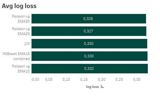 | ZIP | – 30 matches average goal features – home & away performance seperated – Zero inflated Poisson Distribution |