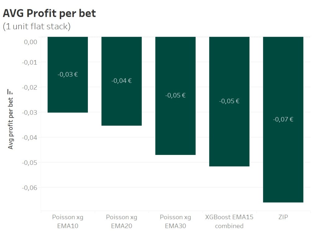 All selected bets are played as a 1 unit (1€) flat stack. Over a course of 8.375 matches the shorterm Vanilla Poisson model shows the best performance with an average loss of -0,03€ per bet. The midterm and longterm Vanilla Poisson model follow. With 8.165 bets and an average loss of -0,07€ the ZIP model performs the worst.