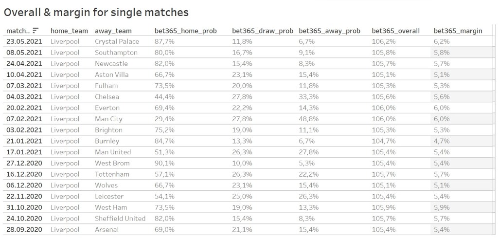 Following picture shows the match overround and match margin for the liverpool home matches in the season 20/21.
