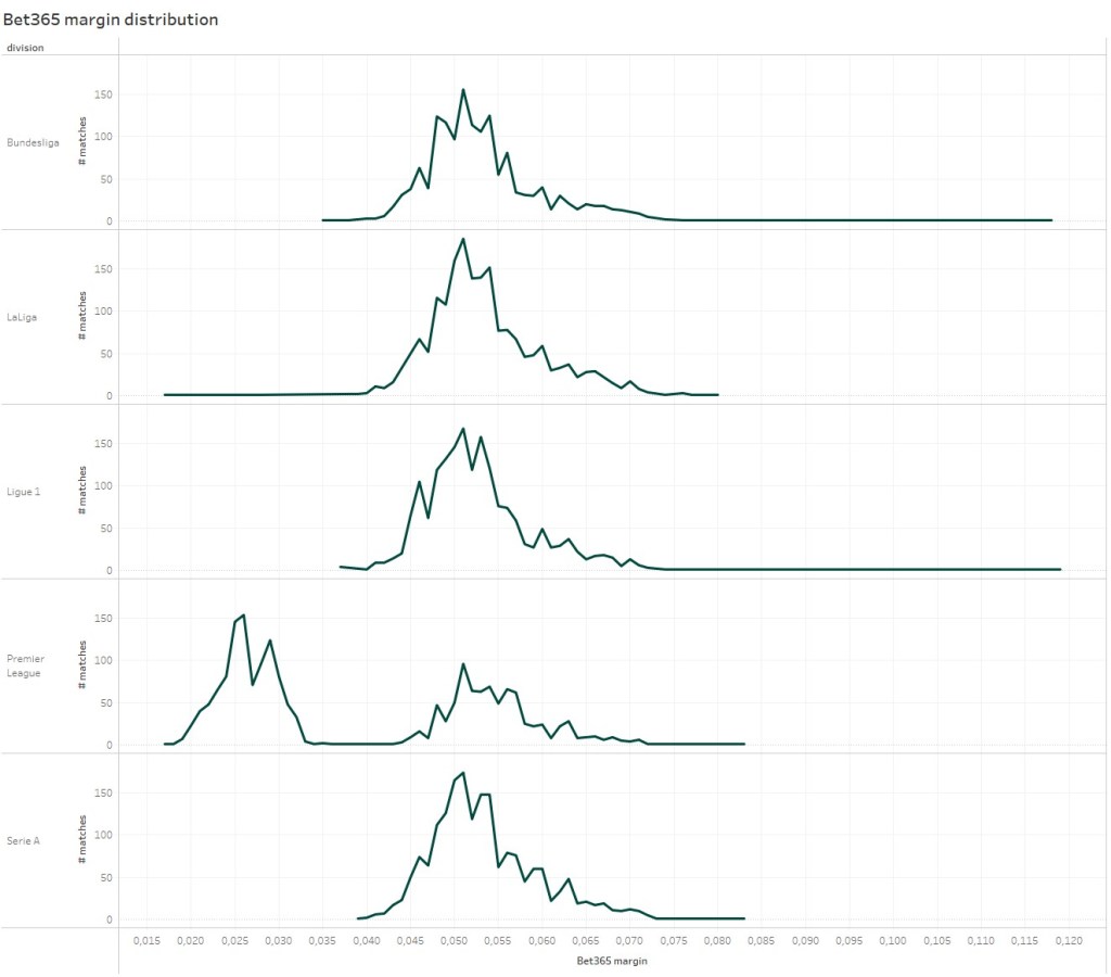 The biggest amount of matches has got an added margin between 4%-6%. But the distribution shows also single matches with a way higher or lower margin. The Premier League margin distribution has also a peak in the area of 2.5% – 3%. This explains the overall lower average in comparison to the other leagues.