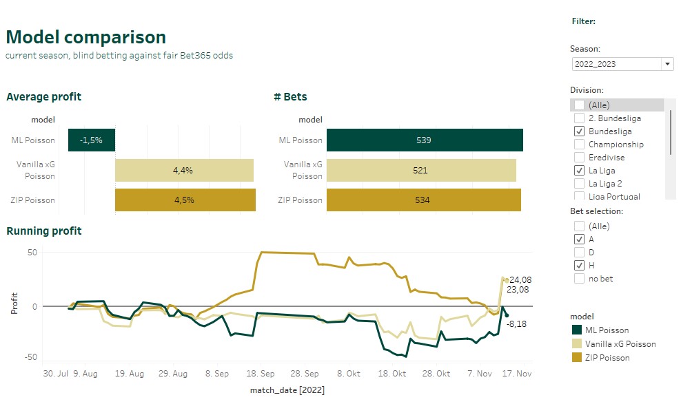 This will be the 2nd blog about my betting performance in the season 2022/23 using my ML Poisson model. The beginning of the season was a sobering one. My theoraticaly worst model performed the best and the ML Poisson model, which I am using for betting showed a really bad profit. So let’s have a look, how things changed in the 2nd part of the first season half.