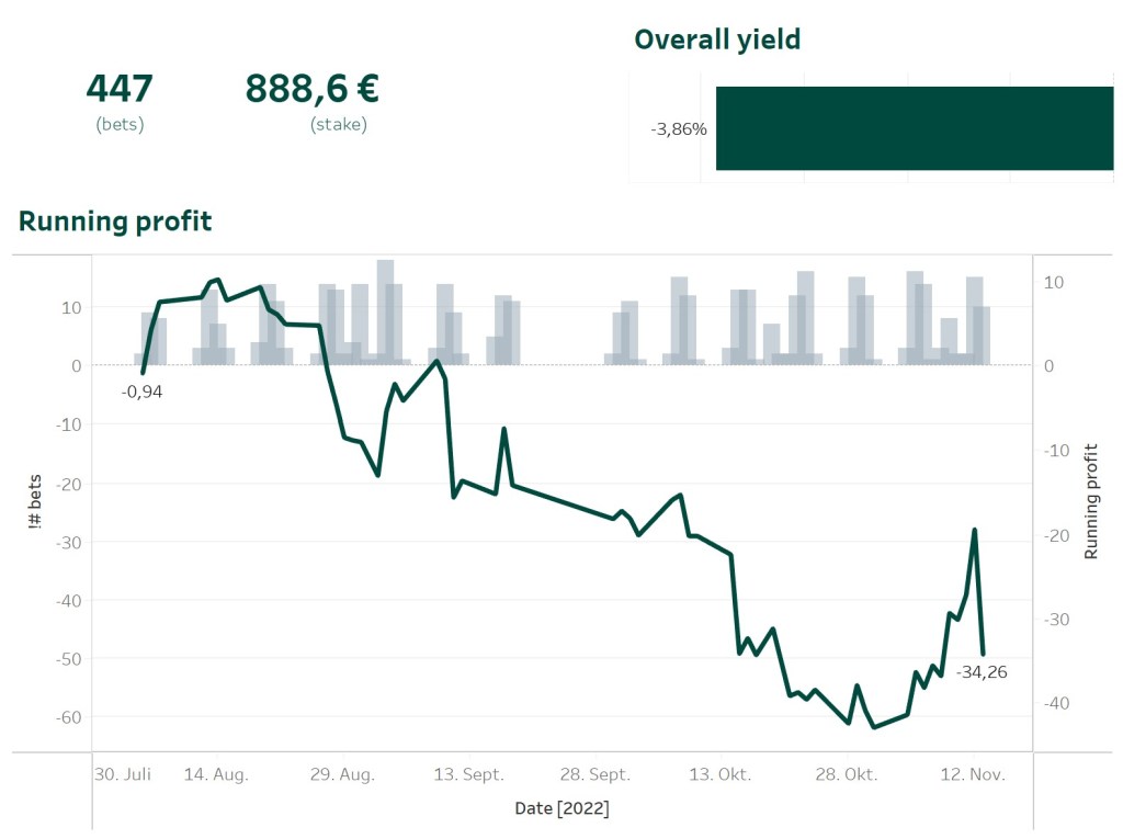 Unfortunately this turning point was just theoretical one. My real-world betting performance does not indicate such a turning point. The yield only slightly improved from -4.15% to -3.86%. But why is there now such a big difference between the theory and the real world?