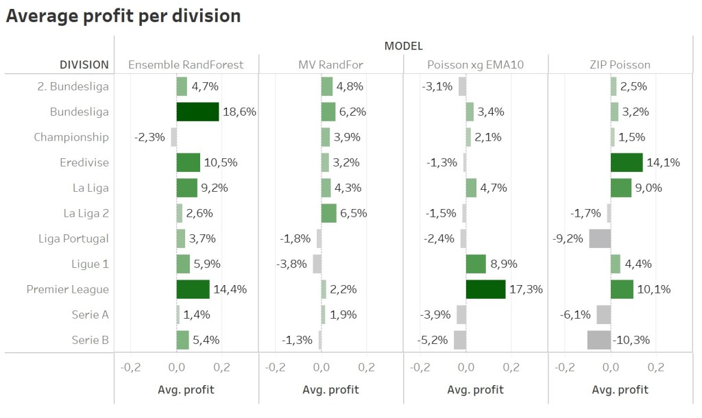 Unfortunately this was not confirmed by the model simulation. Quite the opposite. I created a bunch of different models, based on different prediction methods (regression vs. classification), different time windows (last 5 to 30 matches) and different machine learning algorithms (logistic regression, random forest). But there was no combination, which increased the performance. Models, which did not contain market value data, overall even showed a better performance. And the desire to improve especially non-performing divisions like the Serie A has taken the back seat. But what went wrong? Was my base idea wrong? Is a single model, which get’s extended step by step, not enough?
