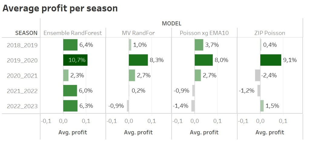 The first backsimulation tests of this model already showed some promising results. The results were so promising, that I even added draw bets and the most problematic leagues Serie A and Serie B. No model was yet able to provide profit for this kind of bets. Theres just the Championship, where the Ensemble model was not able to provide any profit. Taking a look at the profit per season is also very promising. While the old models mainly generated the profit during one season, the ensemble model provides a positiv profit for each season. That’s of course way more interesting for a professional bettor, who needs such a kind of steady profit.