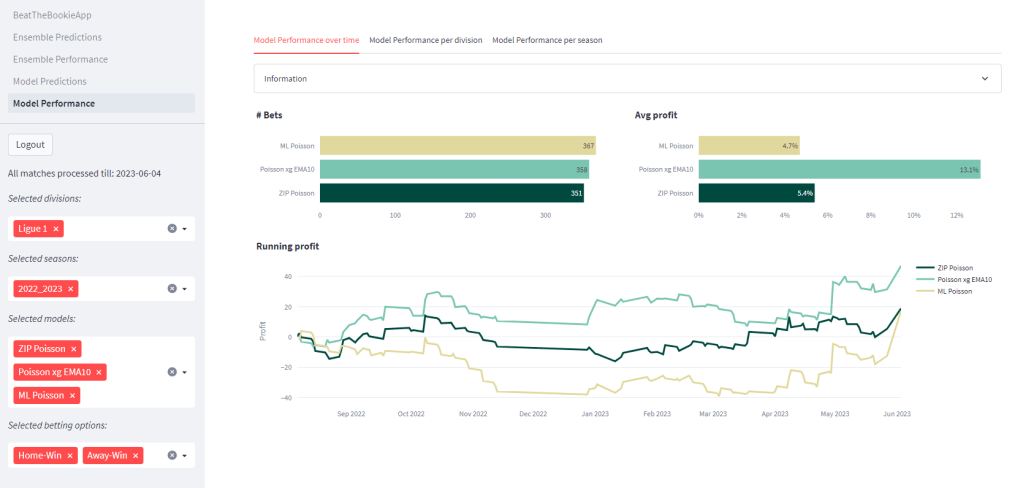 This is also evident in the historical performance of Ligue 1. Overall, the ML Poisson model shows a positive profit at the end, but this was solely due to an upward trend towards the end of the season. Would I have achieved better results if I had continued betting on Ligue 1 matches? That’s a question I am now of course unable to answer.