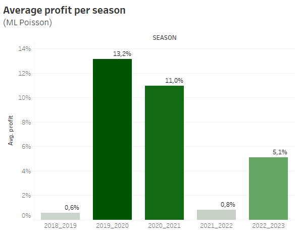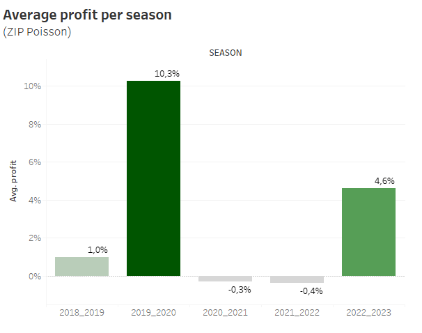 When selecting a model for the BeatTheBookieApp, I primarily prioritized two key aspects: overall profit and profit variance. A noteworthy challenge with my Poisson models lies in the variability of profits across different years. A lower variance translates to a more consistent profit trend over time. Examining the season-specific profits for the Poisson models reveals an approximately 10% difference between different years.