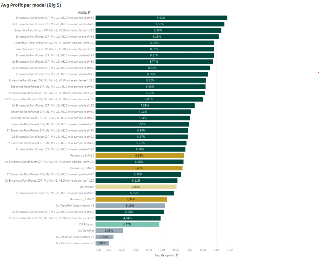 Narrowing our focus to the top 5 leagues reveals a distinct scenario. Within this context, it becomes evident that the Ensemble models that exclude the ML Poisson model exhibit the most noteworthy performance.