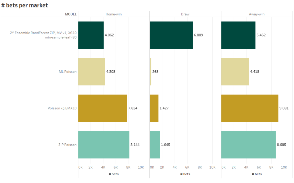 The Ensemble models not only exhibit divergent performance when compared to individual models but also demonstrate a distinct betting behavior throughout the backtesting process. Notably, predicting a draw has historically been a vulnerability when employing Poisson models for football predictions. However, this dynamic appears to differ when it comes to the Ensemble models. These models notably signal value for draw bets on a much more frequent basis.