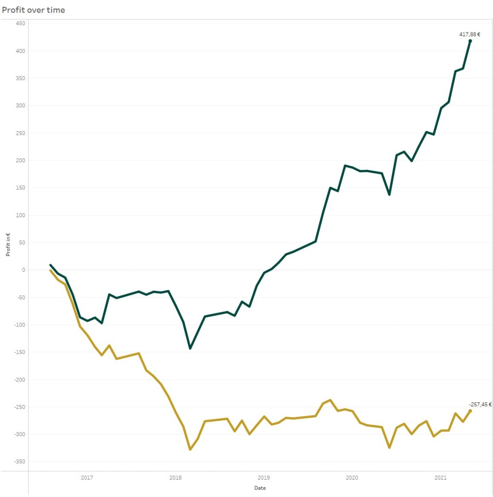 Image you see following picture for two different profit lines. Both betting simulations are based on the same stacking method: Each identified value bet is set with 1 unit flat stack. Which of both simulation would you prefer? I think the answer is easy.